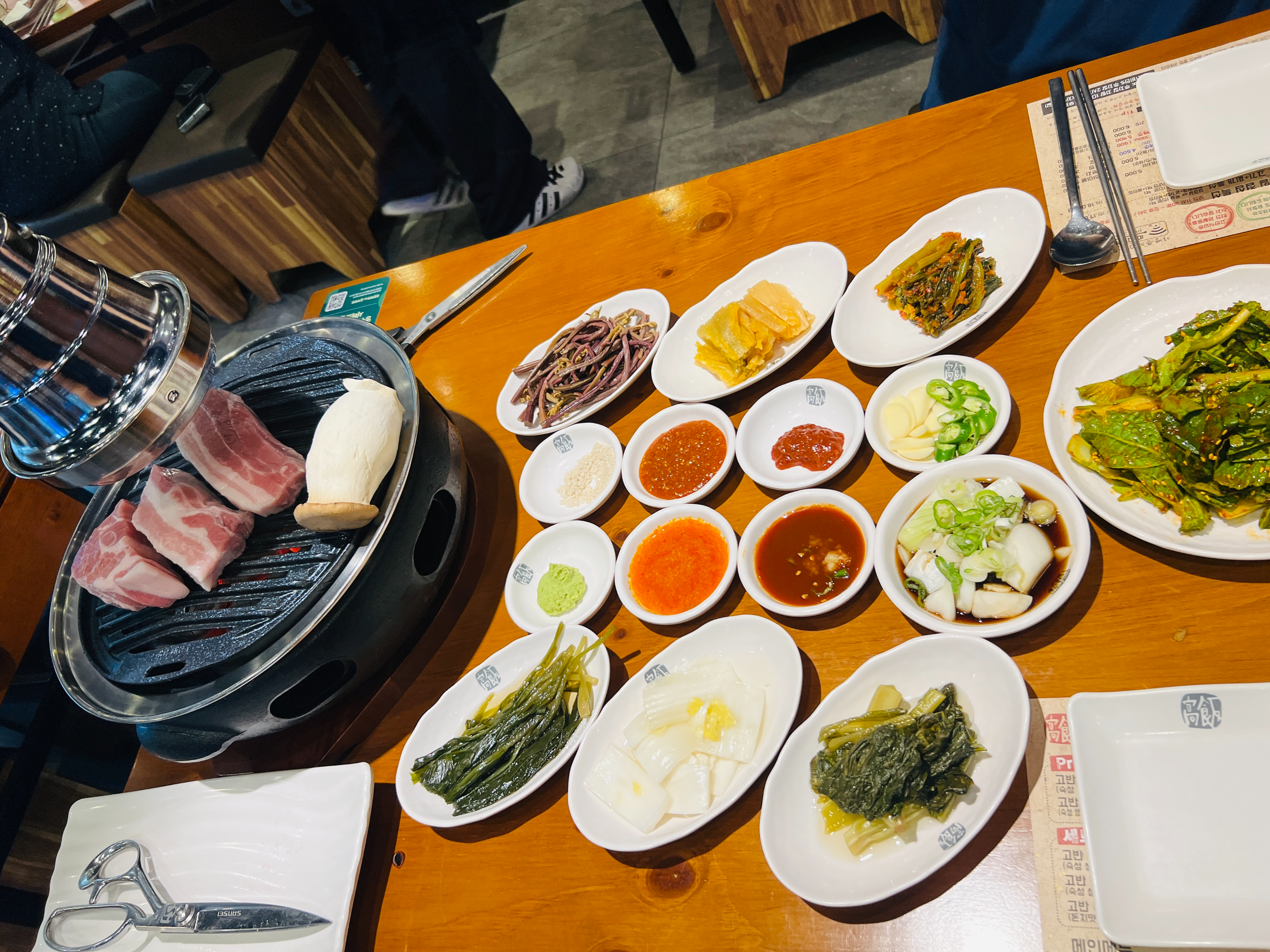 퇴근하자마자 회사 근처에 위치한 관평동 고반식당에 도착했다!!! 바로 옆에 주차장도 있어서 자동차 가지고 와도 주차 부담이 덜해서 좋을 것 같다. 내부 들어오자마자 시원한게 아주 좋았다. 고깃집에서 시원하게 먹는게 생각보다 어려운 부분이 있다. 근데 고반식당은 나갈때까지 덥지 않게 식사를 할 수 있어서 좋았다. 관평동 고반식당의 메뉴는 이렇게 구성되어 있다. 우리는 고반 커플세트 1번을 주문했다. 반찬들이 고기랑 먹기 좋은 것들만 골라서 나온듯한 느낌이다. 그래서 그런지 고기랑 곁들여 먹는데 질리지 않고 먹을 수 있었다. 조금 기다리면 숯불 해서 가져다주는데 이거 열기가 장난 아니다. 그래도 고기는 역시 숯불 못 참는다!!!! 드디어 나온 삼겹살 2인 목살 1인분!!! 커플세트 1번 고기양이다..