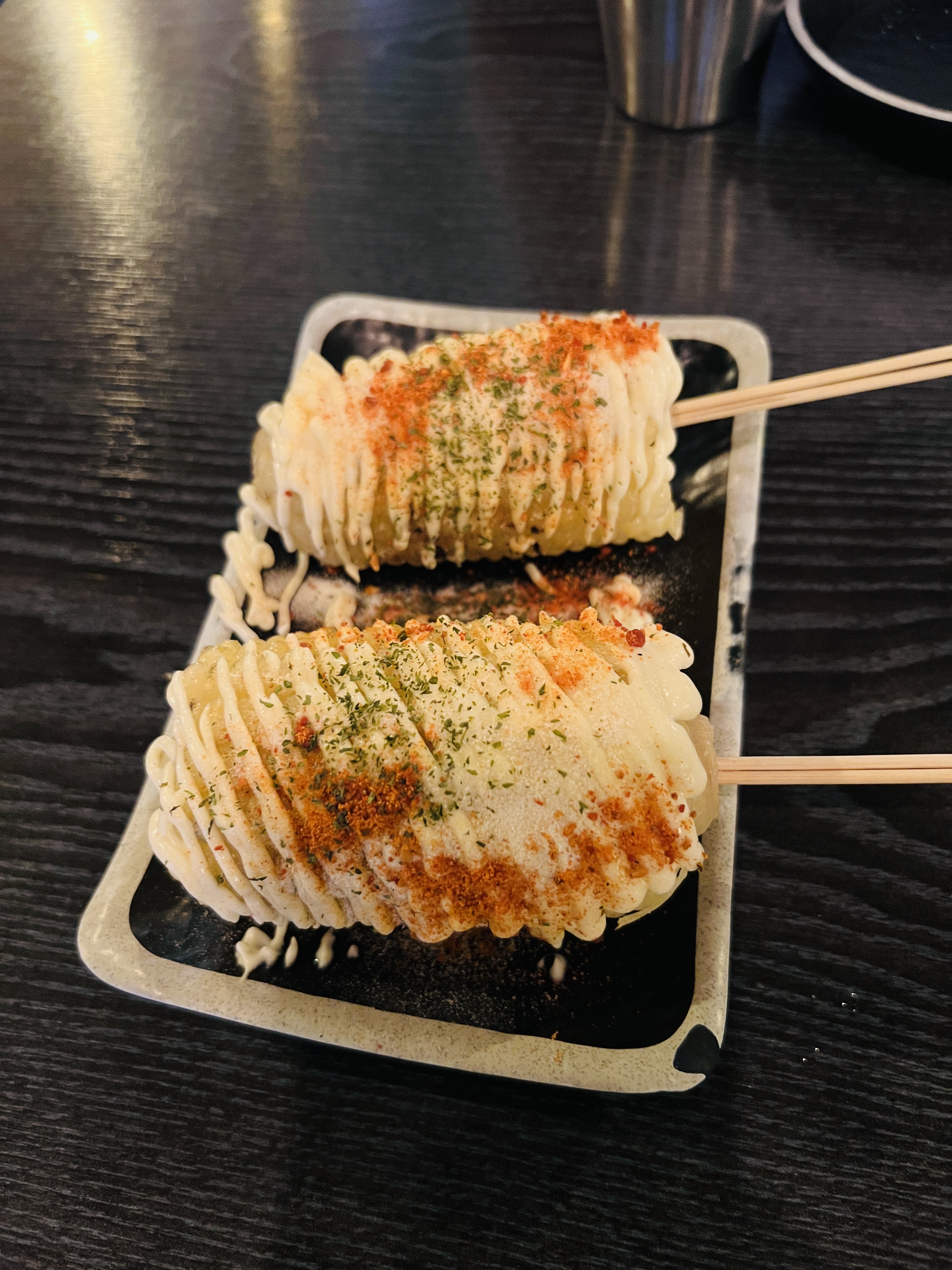 먹성집에서 볶음밥 포기하고 2차 가자는 와이프말에 바로 볶음밥 포기하고ㅋㅋ 2차로온 봉명동에 꼬치는 밤!!! 원래는 노군꼬치 가서 마약옥수수 먹을 생각이었는데... 봉명동 메드블럭에 불이 나는 바람에 못 가게 돼서 꼬치는 밤으로 ㄱㄱ 입구는 이렇게 생겼다ㅎㅎ 앞에 메뉴판이 나와있어서 메뉴구성을 볼 수 있어서 좋았다. 메뉴 구성은 이렇게 되어있고, 꼬치만 시키려면 첫 주문 개수가 정해져 있다. 단품 3개를 시키던지 단품 2개 사이드메뉴 1개 그래서 우리는 단품 꼬치 3종류를 시키게 되었다. 와이프가 그렇게 먹고 싶다고 노래를 부른 마약 옥수수!!! 옥수수에는 간이 적게 되어있고 위에 뿌려진 마요네즈랑 스프맛으로 먹어야 했다...ㅠㅠ 우리 입맛에는 안 맞아서 노군꼬치 다시 갈 예정이다. 두 번째는 명란 다리..
