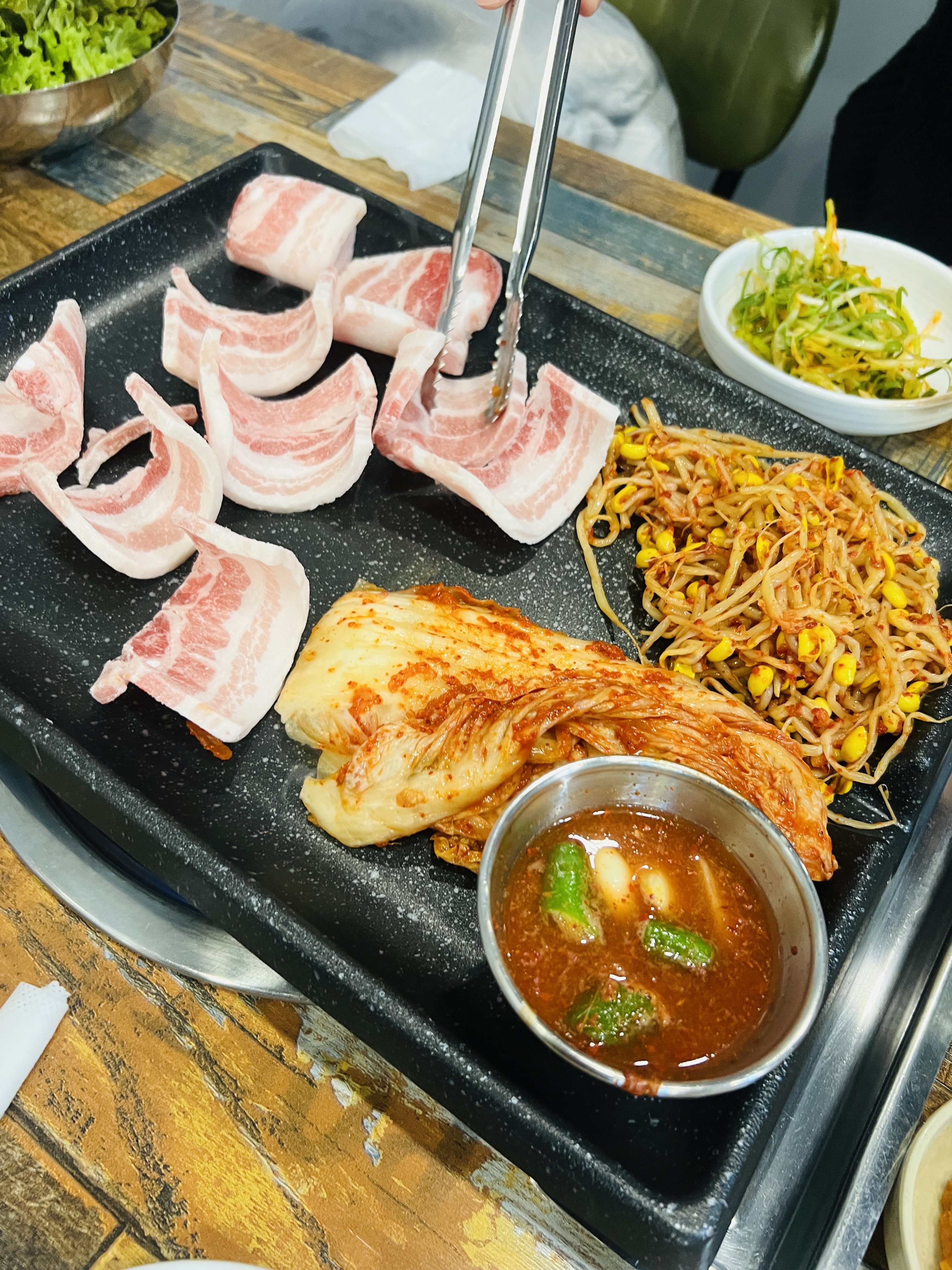 대학 동기들이랑 오랜만에 만나기 위해 찾다가 오게 된 미미삼겹!! 친구가 그러는데 원래 유성문화원 근처에 있다가 여기로 이사온거라고 했다. 봉명동 파출소 옆에 위치해 있어서 찾기는 쉽다. 주차는 어렵다. 봉명동은 차가지고오면 답이 없긴 하다. 우리는 냉동삼겹살을 주문했고 엄청 두꺼운 대패느낌의 냉동삼겹살이었다. 반찬으로 김치, 꽈리고추, 콩나물, 오이무침, 쌈채소를 주고 계란찜에 된장찌개까지 같이 나온다. 반찬만 먹어도 배부를 듯하다. 냉동삼겹살 3인분양이다. 어 적은데?? 할 수 있지만 먹다 보니 양이 많은 느낌이 들었다. 아무래도 반찬이랑 먹다보니 그런 듯한 것 같다. 불판 위 구성은 대패삼겹살느낌이 물신 든다. 그렇지만 미미삼겹 냉동삼겹살이 풍미가 더 좋고 냉동고기구울 때 나오는 찌꺼기들도 안 나와..
