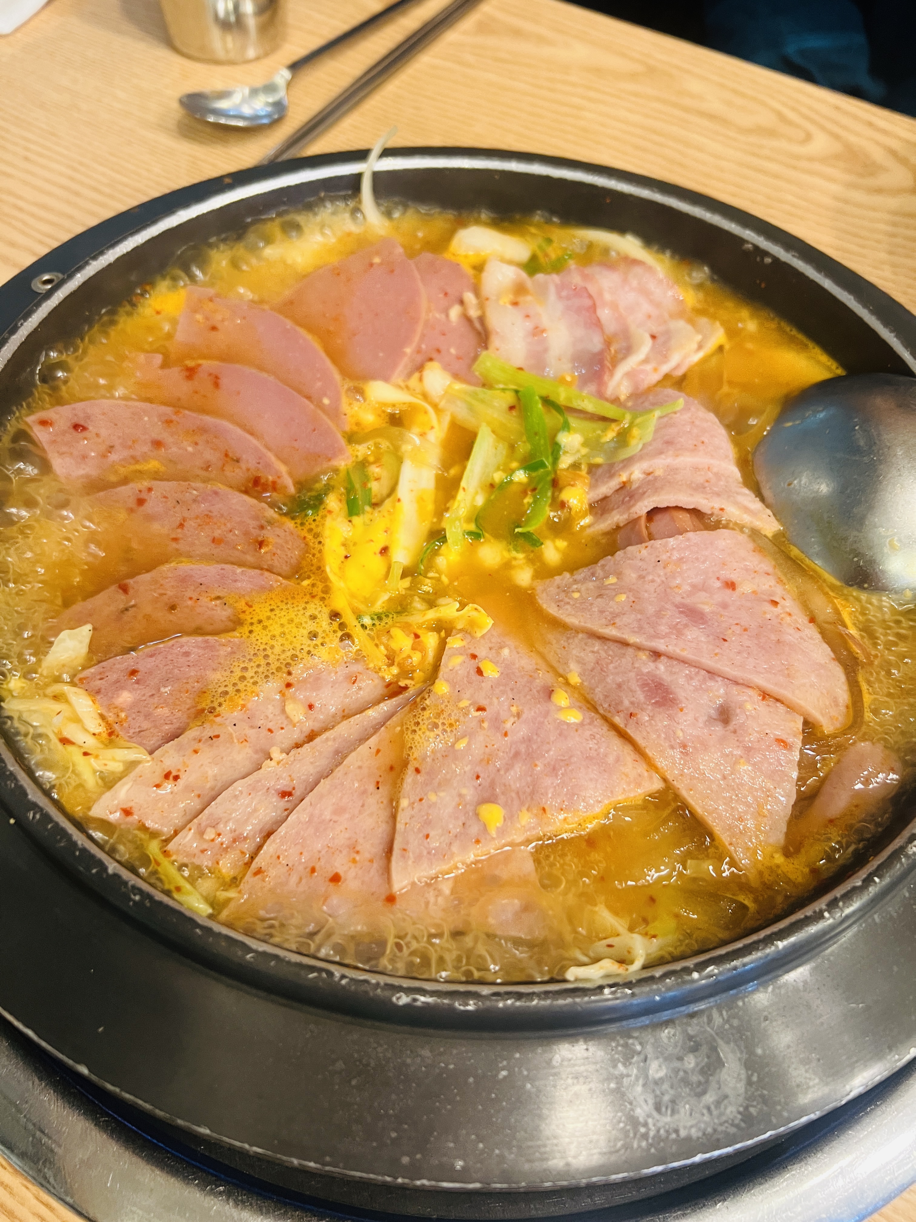 오늘도 퇴근길에 죽동에 들러 저녁을 먹고 가기로 했다!!! 날씨도 쌀쌀해지니 따뜻한 국물먹으러 가자 해서 정해진 부대찌개!!! 죽동 먹자골목에 위치해 있다. 충대 서문에서 나와서 있는 식당가에 있고 엉클 부대찌개 가게 앞에 주차장 있어서 주차가 편하다. 메뉴는 이렇게 구성되어 있다. 밥은 포함되어 있고 라면사리도 무제한 리필이 가능한 것 같다. 자리도 넉넉하게 있고 추가반찬은 셀프바 이용 가능하다. 기본으로 나오는 밥이랑 김치, 콩나물 어묵볶음!! 사실 기본반찬만으로 밥 한 공기 뚝딱 가능하다. 부대찌개 먹을 때는 역시 밥에 버터를 넣어야 제맛!! 밥 따뜻할 때 얼른 넣고 버터를 녹여줬다. 드디어 나온 특제햄 부대찌개!!! 기본 먹으려다가 햄 더 먹고 싶어 주문하게 되었다. 2인분이지만 양도 넉넉해 먹기..
