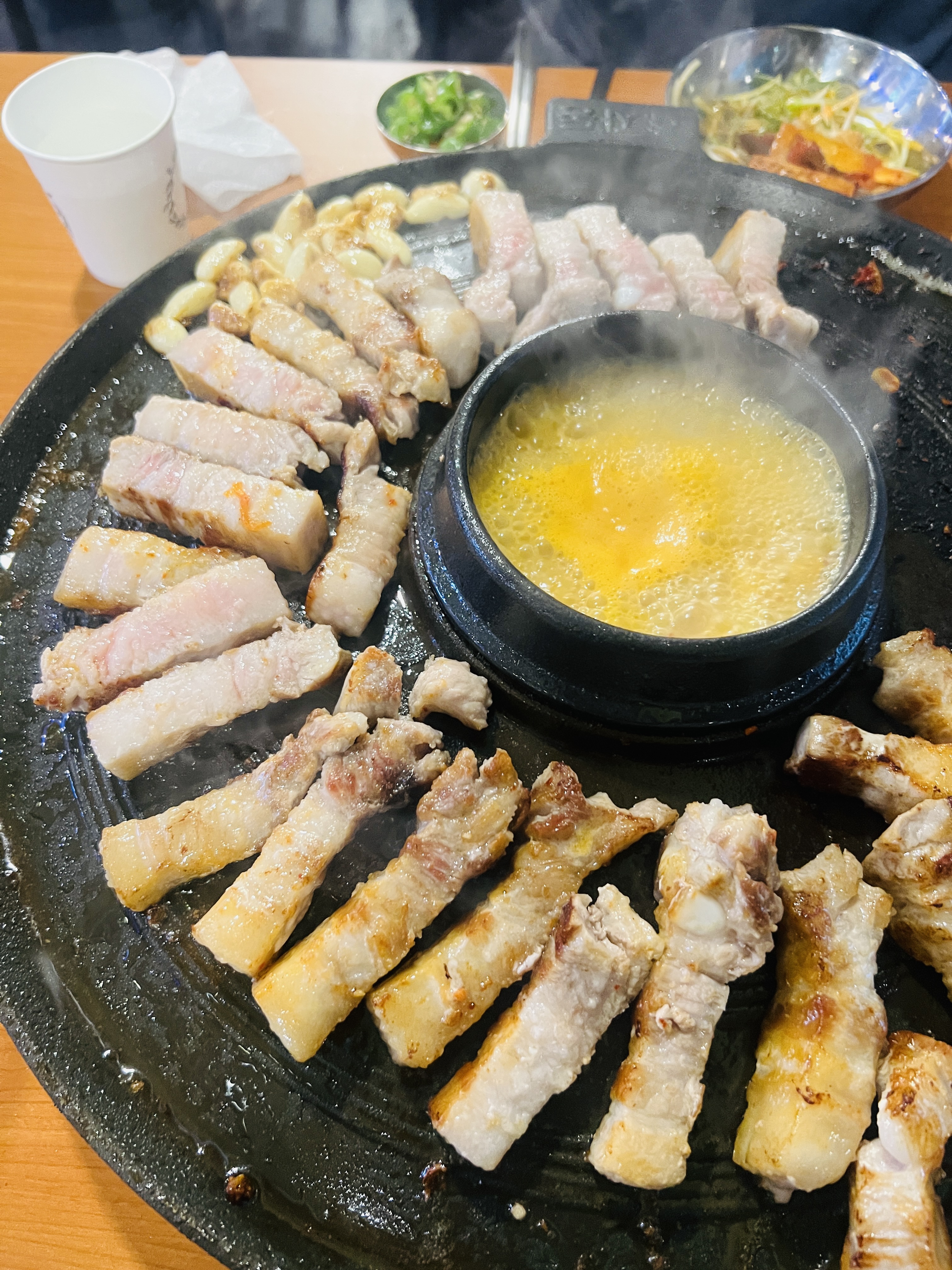 최근 학하동으로 이사를 하고 오랜만에 삼겹살 먹으러 가자고 해서 가본 덕명동 효자동 솥뚜껑!! 대전 한밭대 근처에 위치해 있다. 주변에 주차장이 따로 없어서 길에 주차해야 하고 길 건너 공원 주변으로 주차공간이 여유가 있었다. 2층이지만 엘리베이터를 타고 올라오니 바로 가게 홀이 나왔다! 가게는 생각보다 넓었고 단체로 와서 먹기에도 좋아 보였다. 넓은 자리에 앉아서 흑돼지 삼겹살 600g을 주문했다. 한 근에 35,900원으로 가성비 있었다. 기본반찬으로 된장찌개랑 달걀찜도 있었다. 먼저 달걀찜을 익혀놓고 중간에 된장찌개로 바꿔준다. 나름 고기랑 먹기 좋은 반찬들만 구성되어 있다. 추가반찬은 셀프바 이용가능했다. 김치랑 콩나물은 고기랑 같이 가져다주셨다. 셀프바에도 푸짐하게 잘 준비되어있었다. 된장찌개 ..